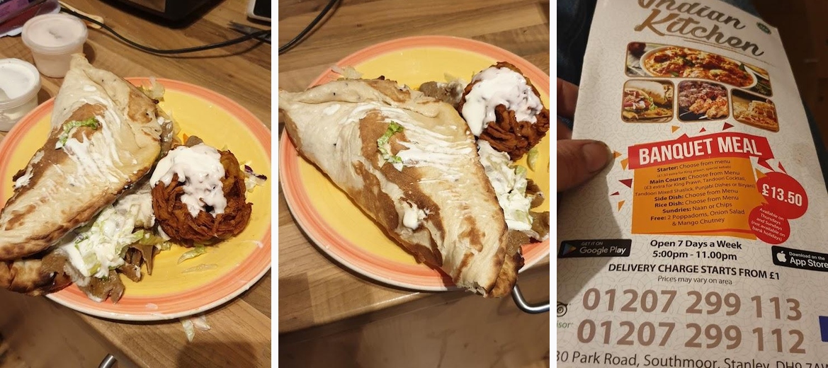 Ordered a mixed kebab in naan with salad, onion bhaji's, mint and garlic sauce. Amazing kebab, chicken, donner and kofta and lovely crispy onion bahji. Arrived 15 mins early too 😋